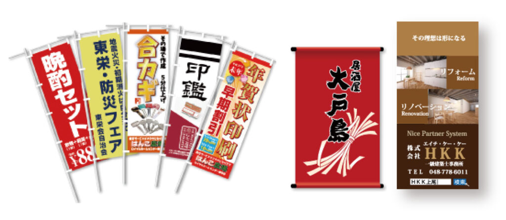 のぼり、たれ幕印刷作製、ステッカー・シール印刷、広報誌印刷、