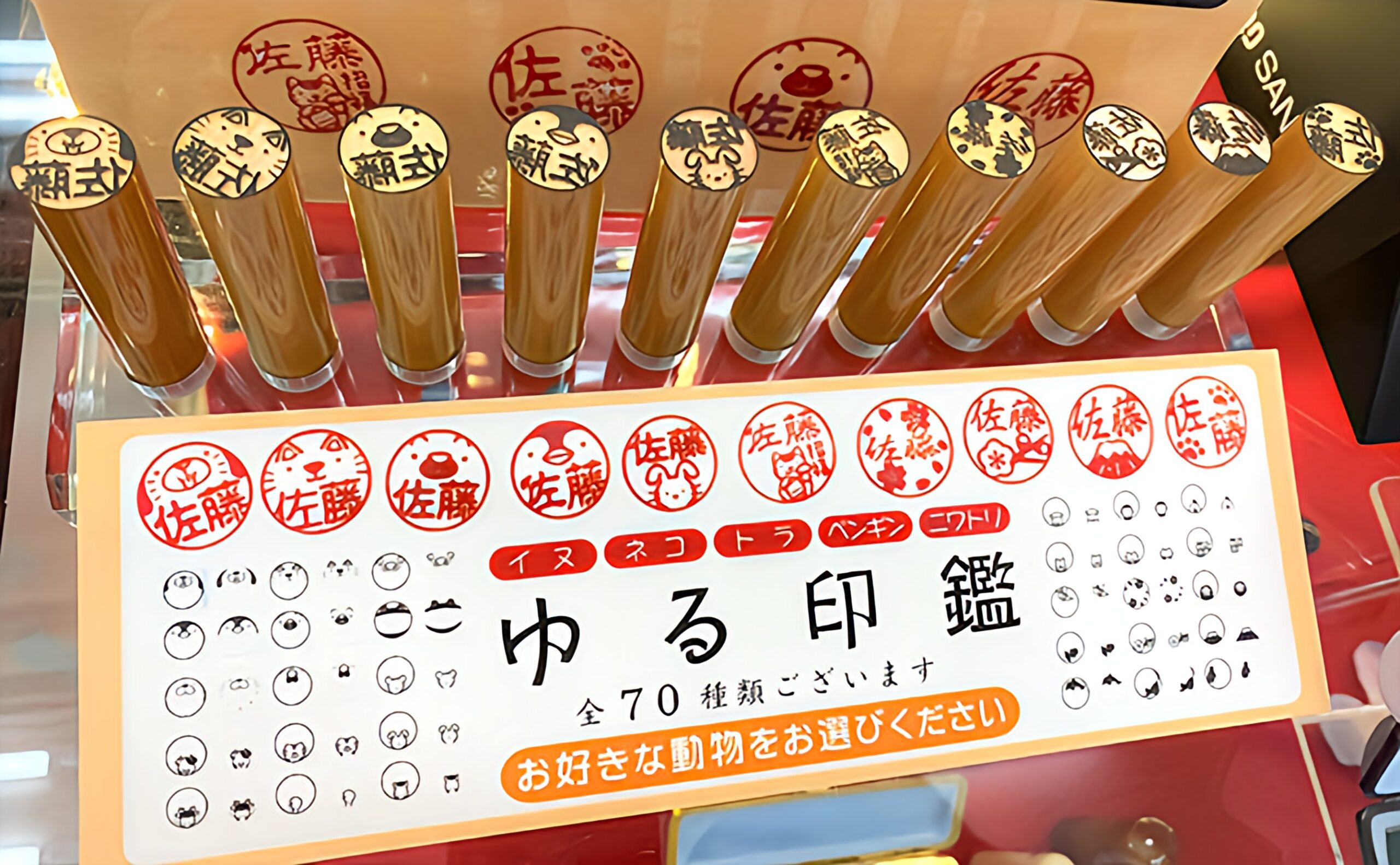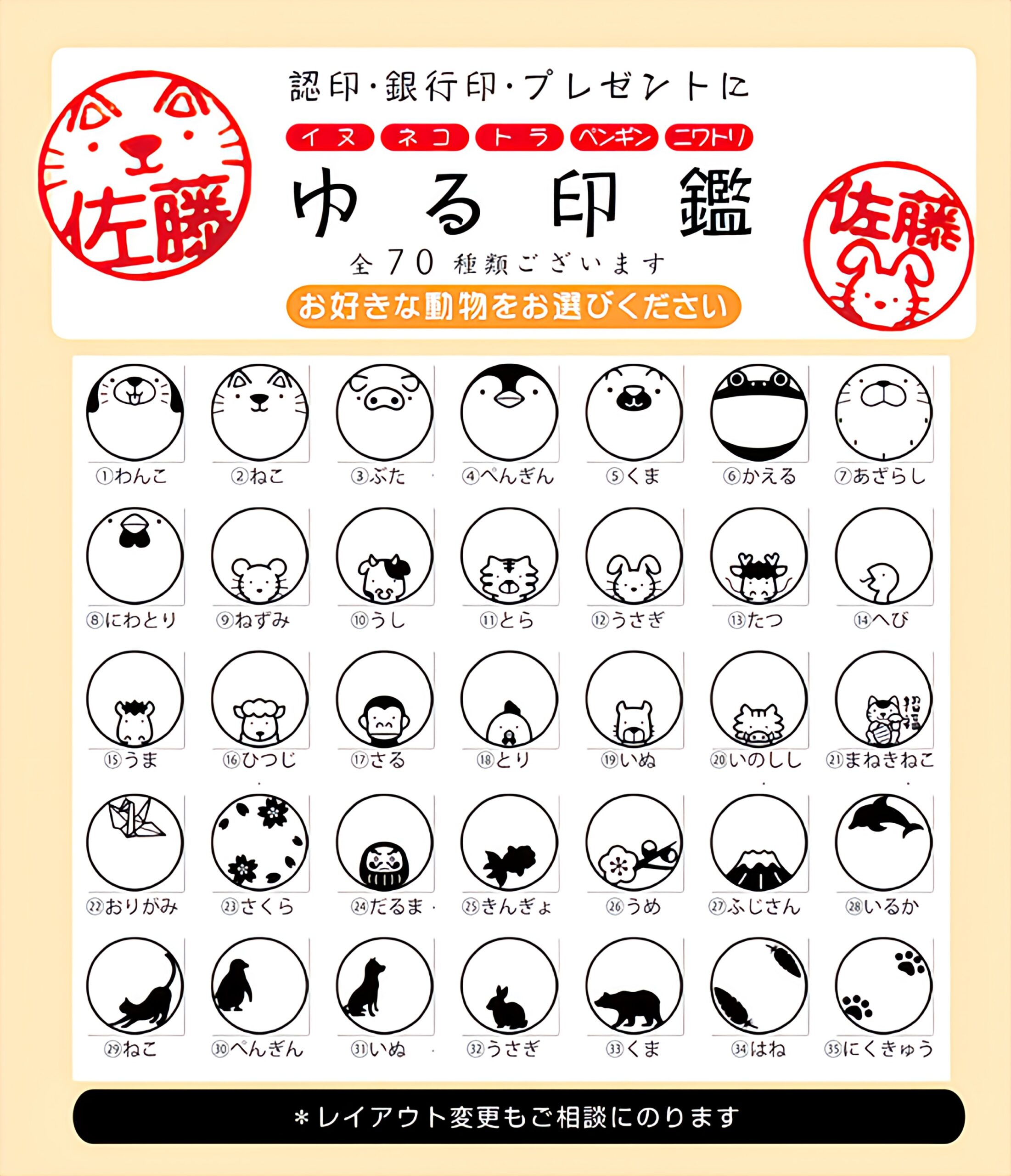 ゆる印=にくきゅうや猫、犬や干支、日本の風物詩などのデザイン印鑑お彫りまします。お店ですぐ彫れます!
